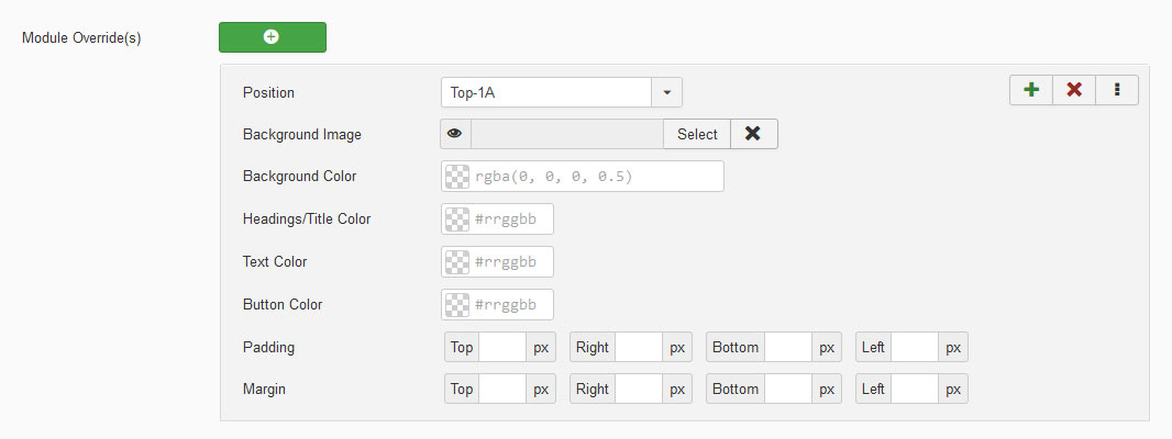 Module Style Overrides allow you to style individual module positions to your own taste. This greatly extends the control of how each of your module positions are displayed with a host of styling options including background image, background color, text color, heading color, button color and module padding. Multiple overrides can be created, each applied to the module position of your choice. Any module position with no override applied will continue to use the default template styling.